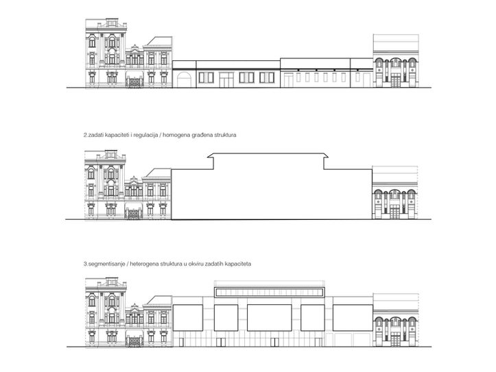 ABOUT: Staro gradsko jezgro Subotice oblikovano je kroz organski razvoj i blokovsku gradnju iz austrougarskog perioda. Takva slojevita arhitektura stvorila je heterogene, ali bogate ulične ambijente. Nova zgrada, koja zamenjuje niz manjih objekata, tretirana je kao segmentisana fasada. Njena podela u manje delove omogućava prirodno uklapanje u okolne strukture, uz ritam lođa i prilagođavanje visinskim vencima suseda. Geometrijska plastika od opeke preuzeta je iz lokalne tradicije i upotrebljena kao savremeni dekorativni element. Donji deo centralnog volumena je razlomljen, dok je pretposlednja etaža povučena, a završni nivo ostavljen kao zaseban volumen. Ovakav pristup obezbeđuje ravnotežu između savremenog izraza i bogatog nasleđa Subotice.