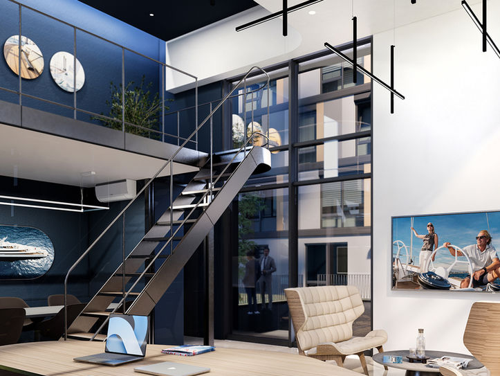 A new space in the city center becomes a sales office for boats and yachts. The classical elegance and luxury of the industry, as well as an overall nautical theme are intertwined with the interior. From the color palette to material choices and spatial solutions everything is there to remind the visitors of the advantages and beauty of boat life. The space has very impressive ceiling height, in order to use the most of it - a gallery is formed above the glass front meeting room. Metal industrial staircase are attached on the side and a simple metal fence continues all the way to the wall above the library. Pockets of space on the sides are used for more technical purposes – a small toilet and kitchen are formed.